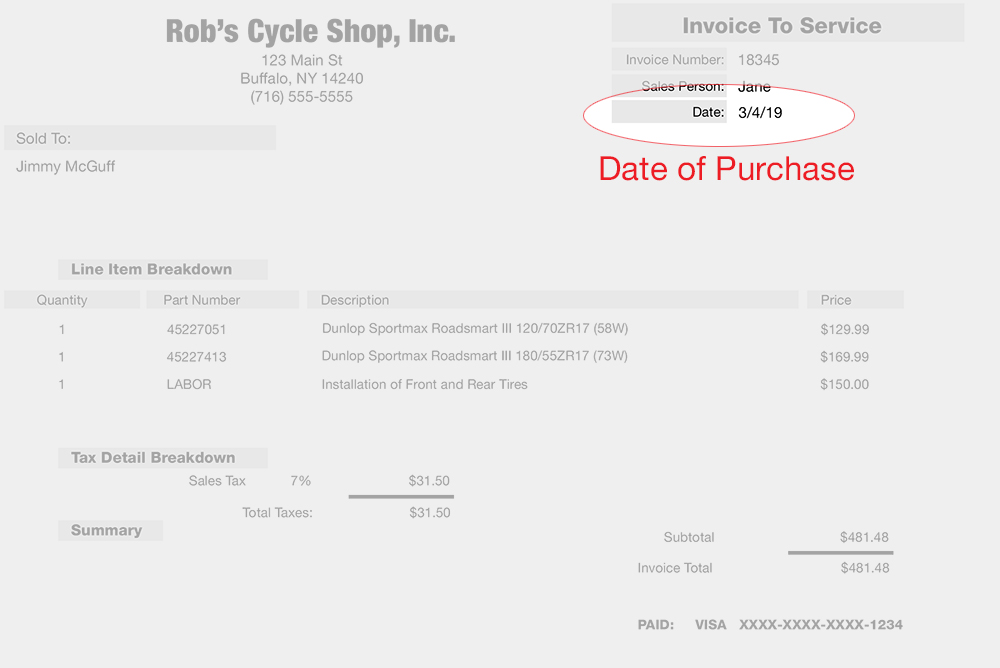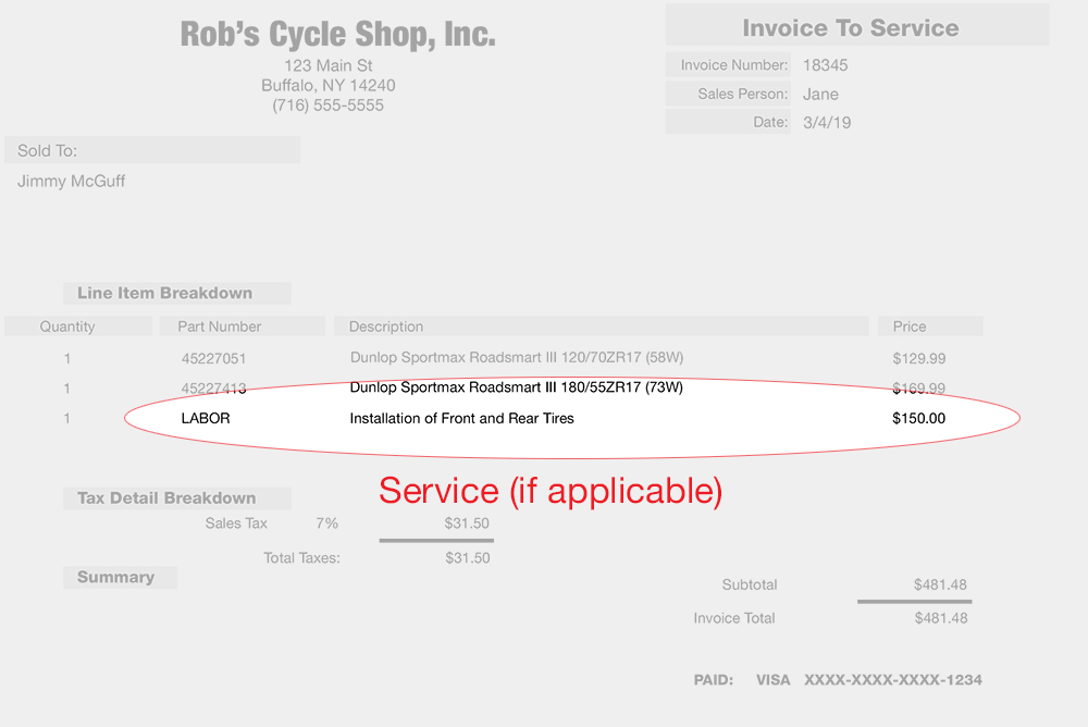 Service is anything that is conducted in the service department. It could be the tire installation, an oil change, installing new brakes pads, literally anything! As long as there is a line item on your invoice that clearly shows a serviceable item, it counts! If the installation is included with the price, make sure mount and balance is shown somewhere on the invoice.